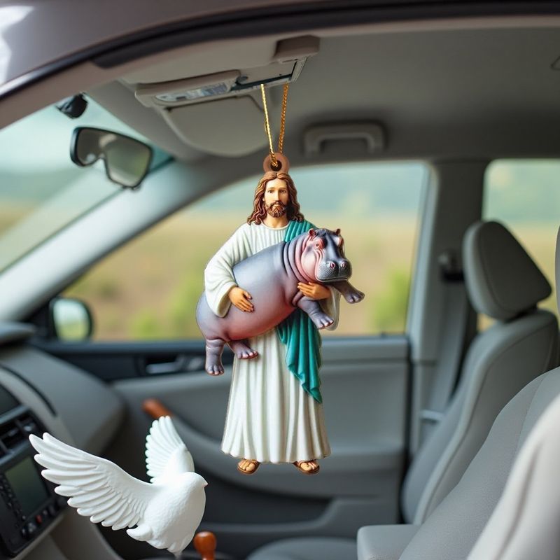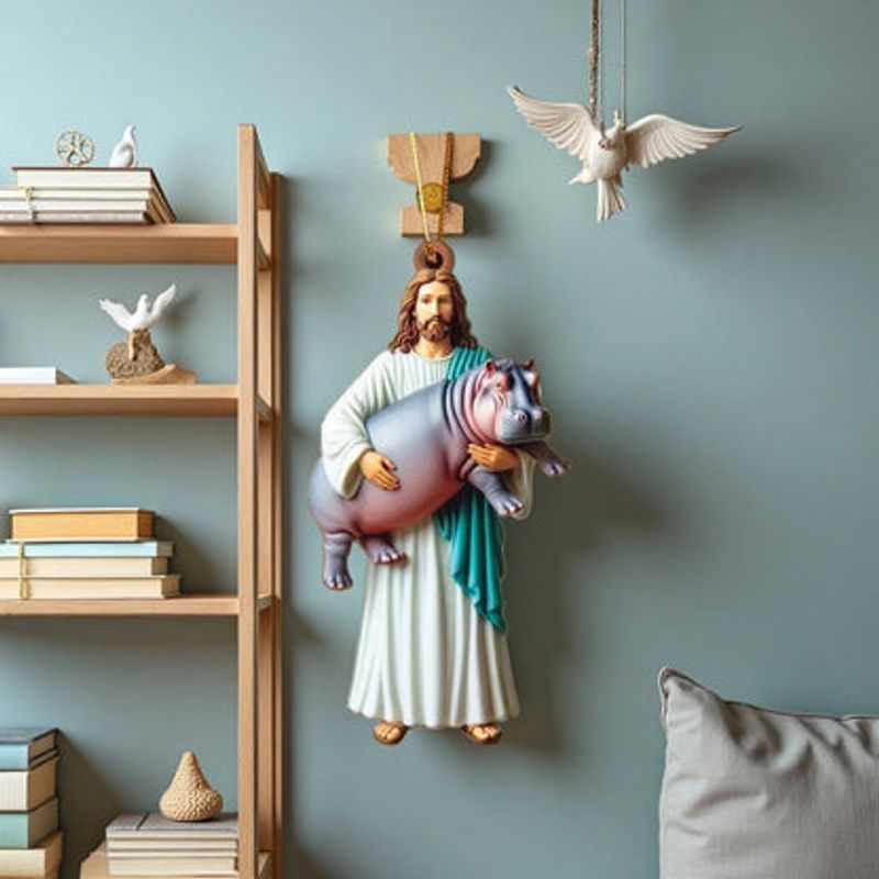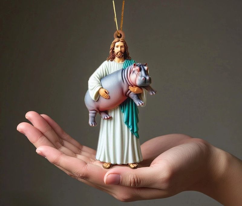 Add a touch of humor and holiness to your everyday life with the Jesus Holding Hippo Ornament.